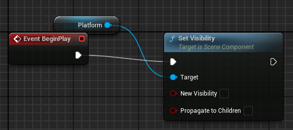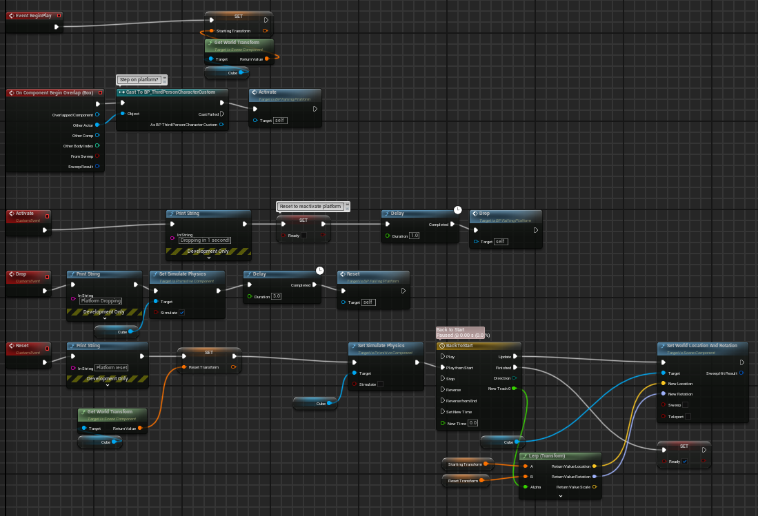 - 2. When overlapped by the player standing on the platform, the platform will fall to the ground after a second by enabling its physics