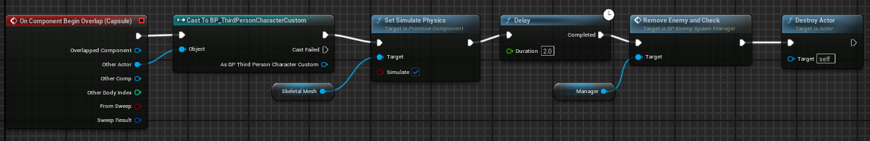 - 1. Enemies have these capsule colliders that when overlapped, the enemy will tumble and ragdoll before disappearing after 2 seconds