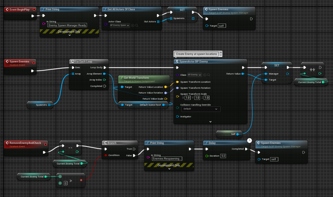 - If it detects that all enemies have been defeated, the respawn manager will respawn all the enemies and the spawn points after 5 seconds